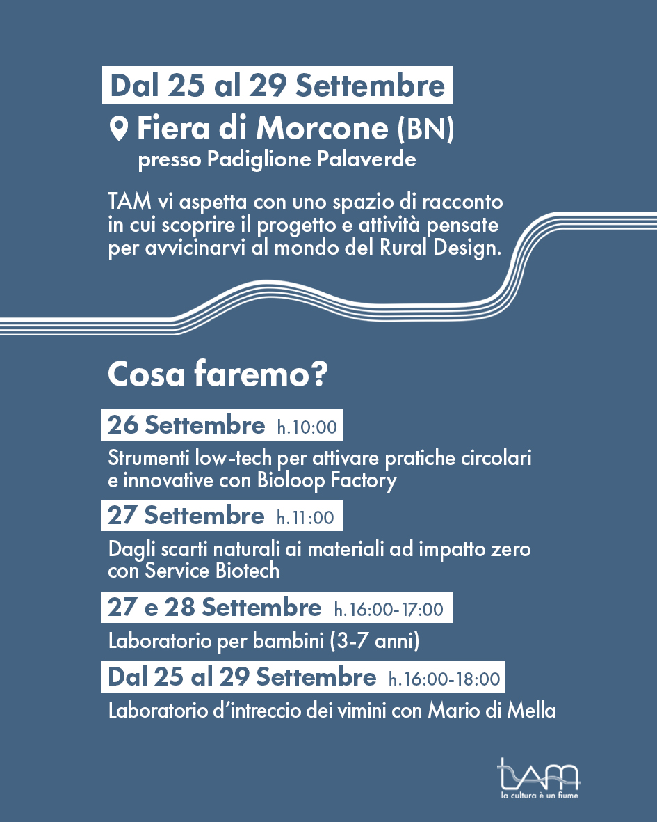 Allo spazio TAM potrete partecipare alle attività in calendario, conoscere da vicino il mondo del Rural Design, scoprire ricerche su materiali ecologici e applicazioni basate sul riuso degli scarti naturali.